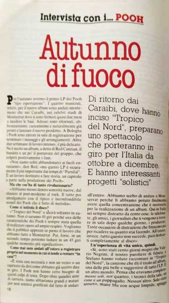 «"Tropico del Nord" e uscirà soltanto in autunno. Non ci saranno 45 giri perché una delle caratteristiche dei Pooh è sempre stata quella di realizzare opere ad ampio respiro. Vogliamo che il pubblico apprezzi in pieno il lavoro che abbiamo fatto a Montserrat. Poi, forse, in un secondo tempo potremo isolare in un 45 giri qualche momento più significativo».