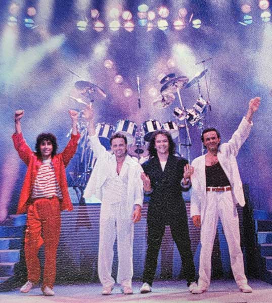 I Pooh durante il Tour Il Colore dei Pensieri del 1987. Forse è questa la foto che è stata usata come base per elaborare la versione definitiva dell'immagine stampata sulla moneta.