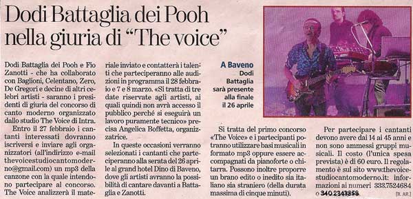 Dodi Battaglia dei Pooh e Fio Zanotti [...] saranno i presidenti di giuria del concorso di canto moderno organizzato dallo studio The Voice di Intra [...].