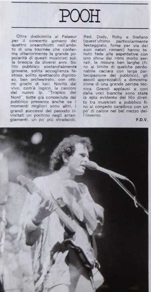 Oltre diecimila al Palaeur per il concerto romano dei quattro orsacchiotti nell'ambito di una tournée che conferma ulteriormente la grande popolarità di questi musicisti sulla breccia da diversi anni. Solito pubblico sostanzialmente giovane, solita accoglienza festosa, solito spettacolo dignitoso, ben orchestrato, con ottimi giochi di luci. Novità dal vivo, com'è logico, le canzoni del nuovo lp, "Tropico del Nord", tutte già conosciute dal pubblico presente anche se i momenti migliori sono altri, i grandi successi del passato rivisitati un pochino negli arrangiamenti, un po' più stradaioli.