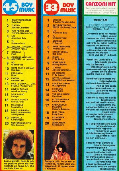 [...] preceduti da un 45 giri inciso tra un viaggio e l'altro "Cercami", i Pooh ritornano alle loro spettacolari performances in Italia dal 14 luglio.