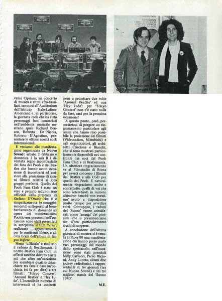 [...] E veniamo alle manifestazioni organizzate da Nuovo Sound: sabato 2 febbraio e domenica 3 la sala B è diventata regno incontrastato dei fans dei Pooh e dei Beatles che hanno avuto occasione di incontrarsi ed assistere alla proiezioni di alcuni filmati relativi ai loro gruppi preferiti. Quello del Pooh Fans Club è stato un vero e proprio raduno, reso ufficiale dalla presenza di Stefano D'Orazio che si è simpaticamente (e coraggiosamente) sottoposto al bombardamento di domande ad opera dei numerosissimi Poohlovers presenti; nell'occasione sono stati presentati in anteprima il film "Viva", realizzato appositamente per le emittenti libere, e alcuni brani dell'album in inglese [...].