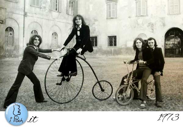 Data e luogo sconosciuti. Servizio realizzato dal fotografo Egizio Fabbrici. Nella prima foto, da sinistra: Stefano D'Orazio, Roby Facchinetti, Red Canzian, Dodi Battaglia.
