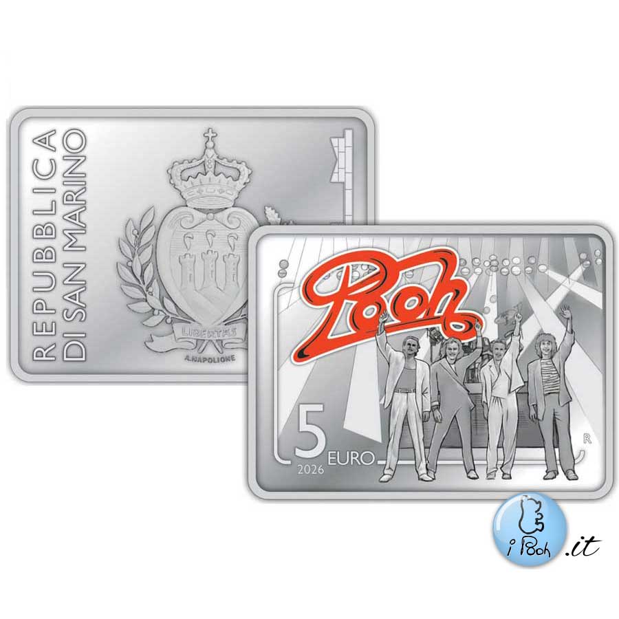 Ci sono novità per quanto riguarda la moneta celebrativa che la zecca della Repubblica di San Marino dedicherà ai Pooh. Come anticipato nel precedente articolot "POOH 60 - La nostra storia continua", la moneta sarà rettangolare, in argento con finitura proof, 5 Euro di nominale. Il costo sarà di 69 Euro. Finalmente è possibile ammirarne la grafica: su di un lato sono riportati il nome e lo stemma della piccola nazione. Sull'altro, a giudicare dall'abbigliamento, è immportalato un momento del "Tour Il Colore dei Pensieri" del 1987. In alto a sinistra campeggia il logo dei Pooh di colore rosso, mentre in basso troviamo il valore nominale della moneta e l'anno di conio.